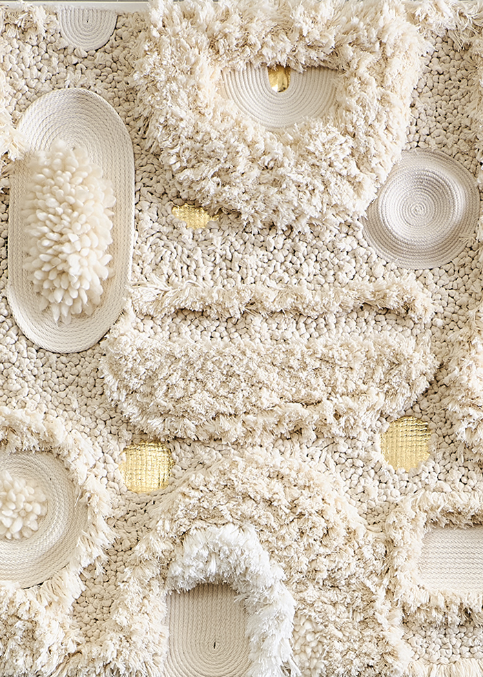 A landscape of texture—woven depth, organic cotton, and luminous metallics.
